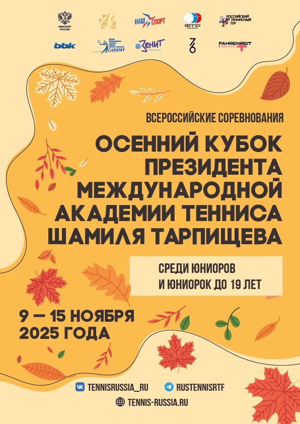 На днях завершились Всероссийские соревнования среди юниоров и юниорок до 19 лет - «Осенний Кубок президента Международной академии тенниса Шамиля Тарпищева» По итогам турнира медали распределились следующим образом: Одиночный разряд - юниоры 1. Прокошин Максим 2. Лукьянов Матвей 3. Чикин Глеб Одиночный разряд - юниорки 1. Миллер Катарина 2. Титова Маргарита 3. Водолаженко Ксения Парный разряд - юниоры: 1. Буланцев Алексей/Медведев Роберт 2. Матвеев Иван/Молгин Иван 3. Аулов Степан/Гуляев Ярослав Парный разряд - юниорки 1. Плешивцева Кира/Юнева Алина 2. Подсыпанина Дарья/ Черных Анастасия 3. Миллер Катарина/Титова Маргарита «Осенний Кубок президента Международной академии тенниса Шамиля Тарпищева» является единственным соревнованием такого уровня в Московской области, большая честь принимать на кортах ЦРДС «ЗЕНИТ» будущих звезд российского тенниса